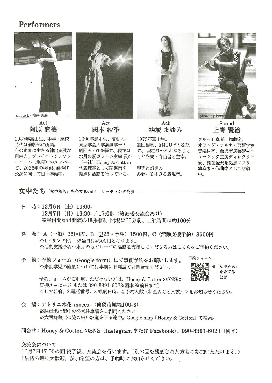 | 時間 | 12月6日(土)19:00〜 12月7日(日)13:30〜/17:00〜(終演後交流会あり) ※受付開始は開演の1時間前、開場は20分前、上演時間は約100分 |