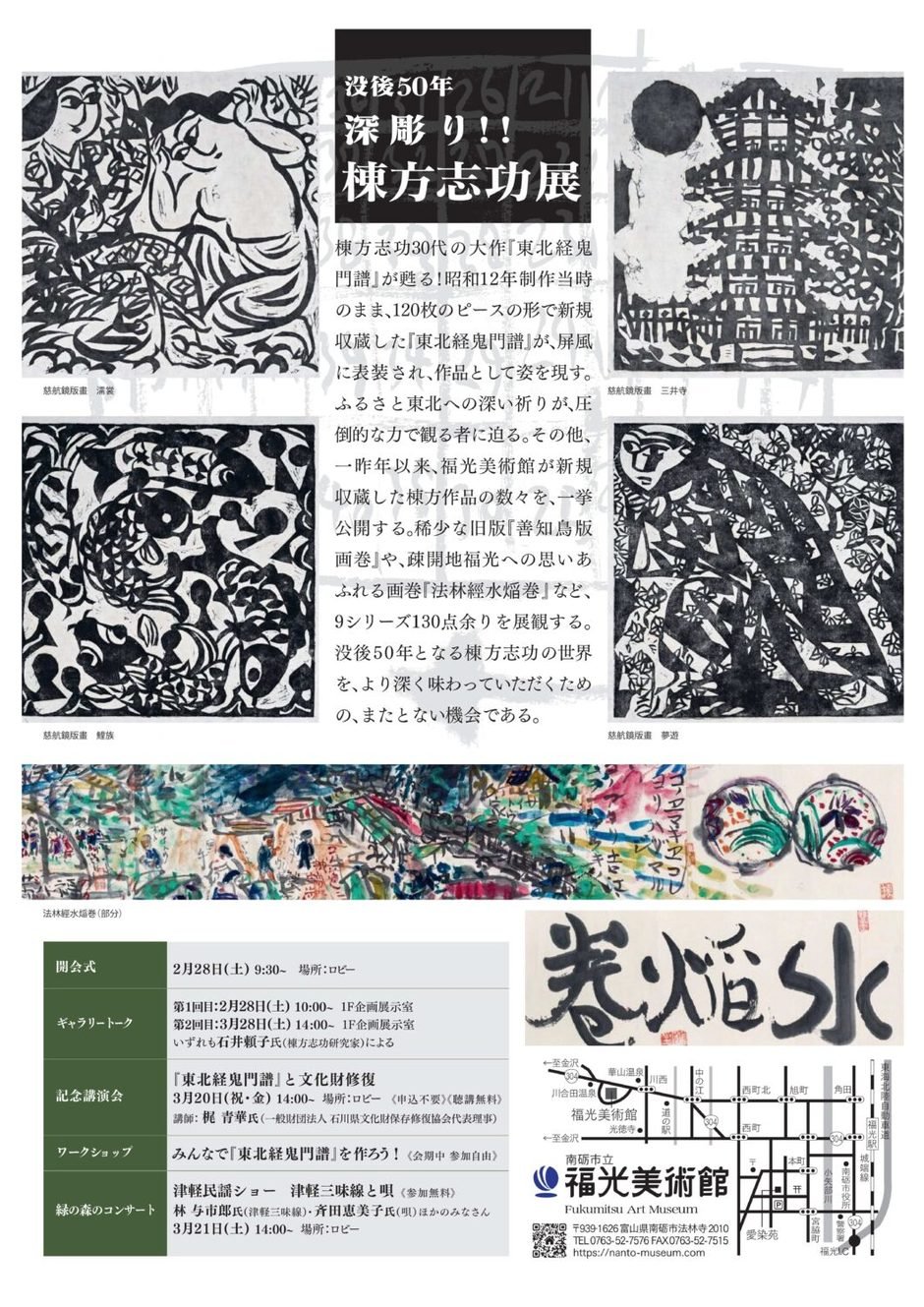 棟方志功没後50年に際し、近年収蔵作である戦前の傑作板画シリーズを一堂に展示。