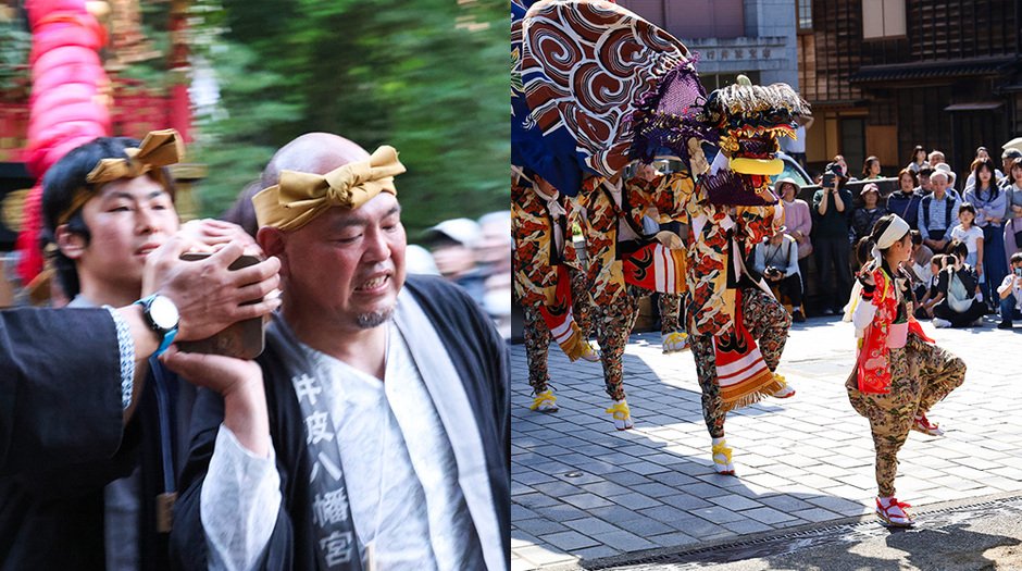 大人が担ぐ神輿は3種類あり、子ども神輿と合わせて6つの神輿が町内を練り歩き、3つの獅子と4つの屋体とともに町内を賑わせます。担ぎ手が約10kmを巡行する様、そして井波彫刻の技が光る獅子頭も見どころです。