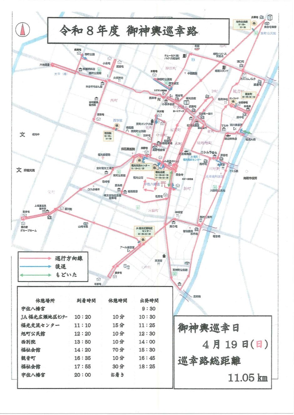220年以上の歴史を持つ由緒ある行事で、その伝統は今も受け継がれています。祭り当日には福光地域住民の厄年男性が御神輿を担ぎ、丸1日かけて約11kmを巡行します。